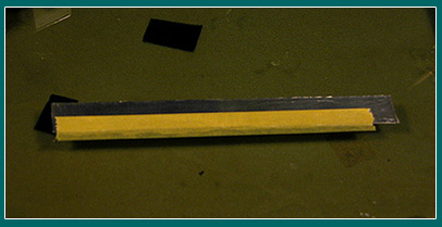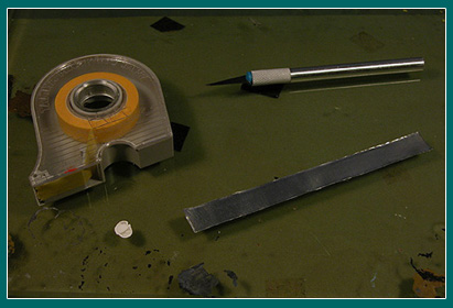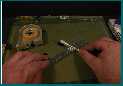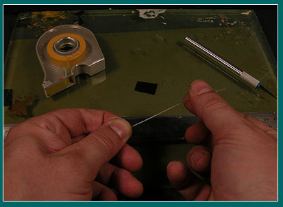 | A l'aide de la règle et du cutter, coupez une première bande trés fine, vous obtiendrez un bord franc et rectiligne. A partire de ce bord de réference, coupez une serie de bandes parallèles les plus fines possible (1,5 mm maximum). | ![]() |