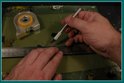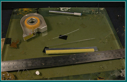 La "recette" : Disposez le carreau de verre sur votre plan de travail, dépliez la bande de plomb fournie par le fabriquant et laminez celle-ci avec la partie lisse du manche du couteau. Evitez de le faire rouler comme un rouleau à patisserie, car la bande s'arrondira et se déformera un peu plus. |