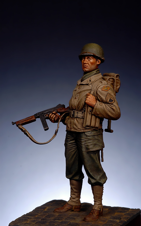 Sergent,2nd U.S. Rangers Battalion, Companies D,E,F, Point du Hoc, Normandie 6 Juin 1944, sculpture Adriano Laruccia(Soldier54mm). |